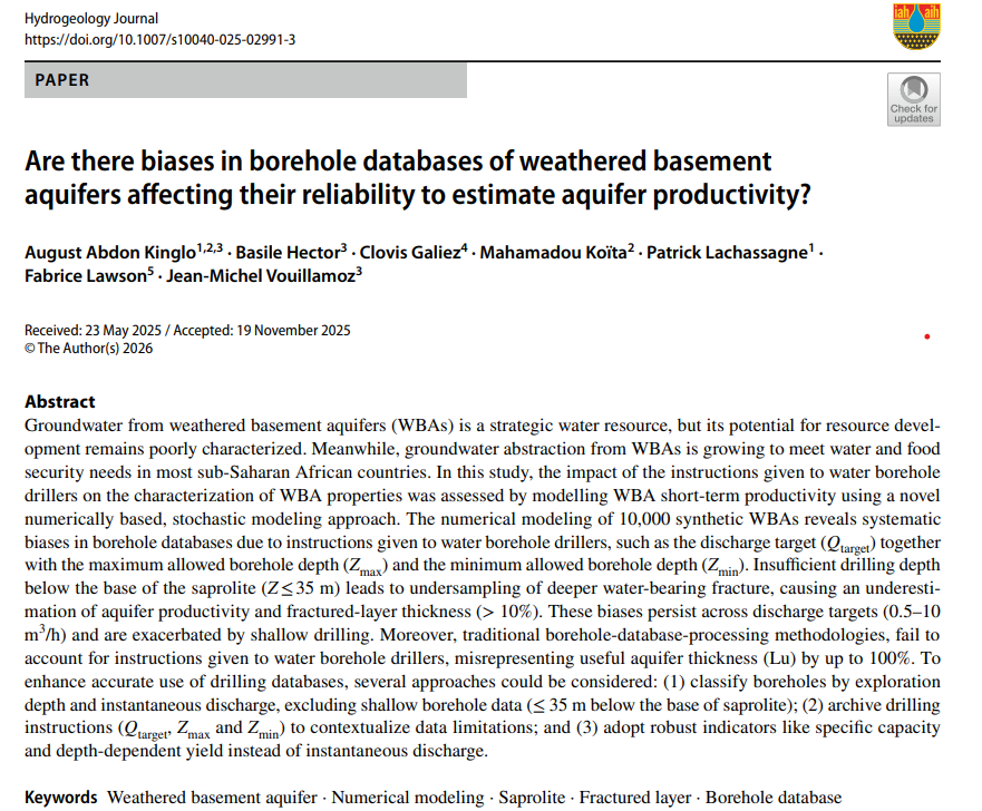 below the base of the saprolite (Z≤35 m) leads to undersampling of deeper water-bearing fracture, causing an underestimation of aquifer productivity and fractured-layer thickness (> 10%). These biases persist across discharge targets (0.5–10 m3/h) and are exacerbated by shallow drilling. Moreover, traditional borehole-database-processing methodologies, fail to account for instructions given to water borehole drillers, misrepresenting useful aquifer thickness (Lu) by up to 100%. To enhance accurate use of drilling databases, several approaches could be considered: (1) classify boreholes by exploration